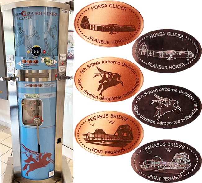 Retired 1 (Steel): 1) Logo with 'RanVille-Benouville Memorial Pegasus', 2) Horsa Glider with 'RanVille-Benouville Memorial Pegasus', 3) Pegasus bridge with 'RanVille-Benouville Memorial Pegasus'