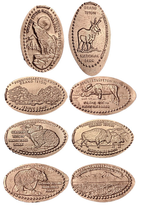 Retired Mini Tokens: 1) Front: Standing bear with 'Grand Teton National Park EST. 1929' / Rear: The Tetons with 'Grand Teton National', 2) Front: Grand Teton with 'Grand Teton National Park' / Rear: A bear with 'EST 1929', 3) Front: Moose in a river in front of the Tetons with 'Grand Teton National Park' / Rear: Moose with 'EST 1929', 4) Front: Cut-out of a moose with 'Grand Teton National Park' / Rear: Reverse image of the front.