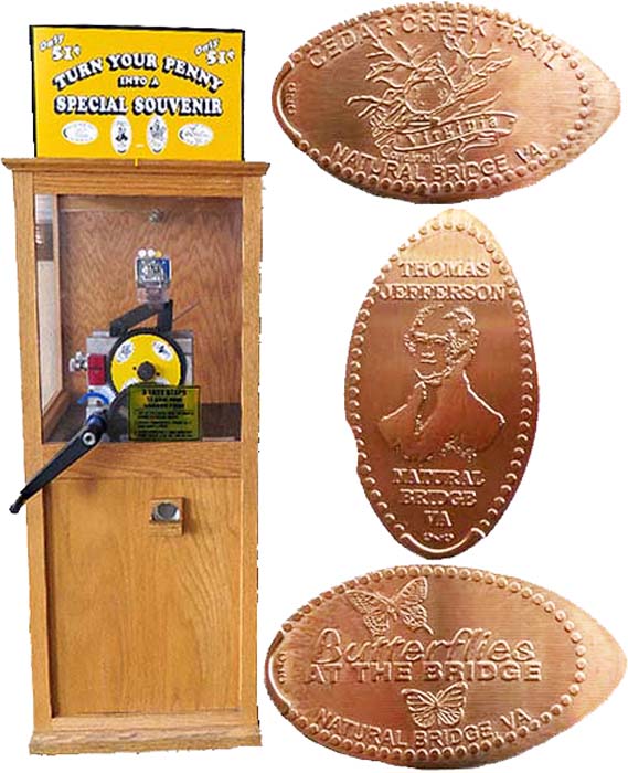Machine 6: (2019) is at the top of the stairs going to the lower level, very close to machine 5. All have 'Natural Bridge Virginia State Park' on them. Designs are: