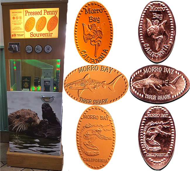 Moved 3 Moved to Under the Sea Gallery next to Rose's Bar & Grill at 725 Embarcadero. Cost to press: 51¢ for each design. All have 'Morro Bay': on the. 1) (V) A diving pelican with 'California', 2) (H) A swimming shark with 'Tiger Shark', 3) (V) A squatting surfer on a surfboard with 'California'.