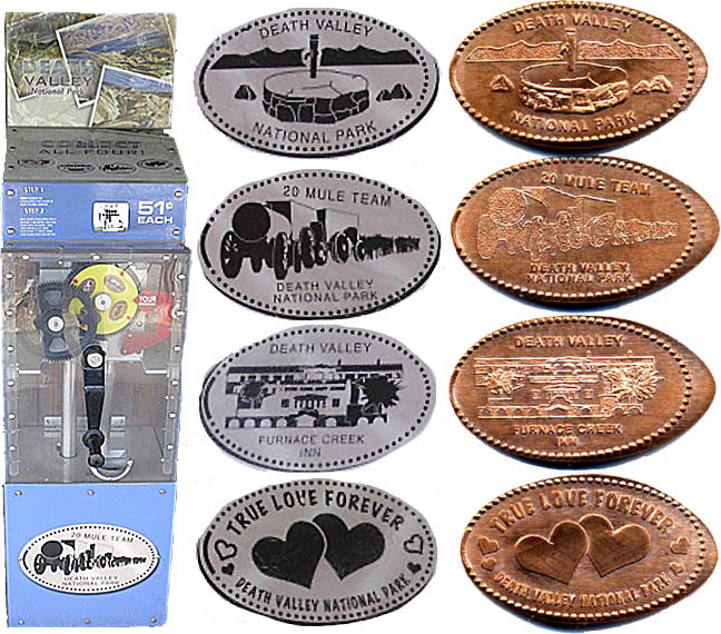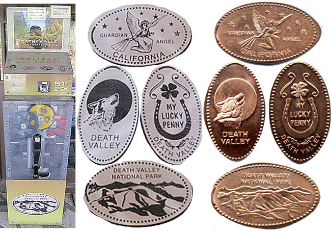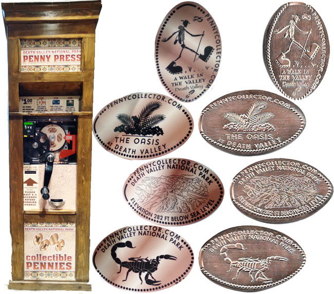 Available at the Visitor Center is the Death Valley National Park token book ($4.99). This book is designed to hold the pewter national park tokens (about the size of a nickel), but will easily fit smashed pennies -- there are enough spaces in the book to hold all pennies available in Death Valley, including the machines at Furnace Creek Ranch and the new machines at Stovepipe Wells.