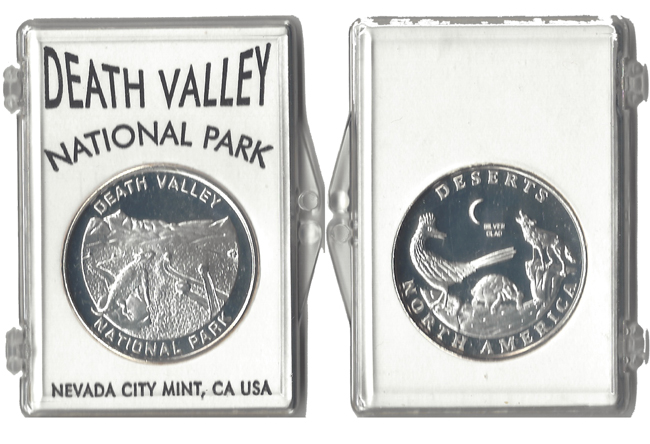 1) Front- (on Case) 'Death Valley National Park, Nevada City Mint CA. USA, (on Coin) 'Death Valley National Park', the image of Death Valley with Iguana and rolling rocks/ Rear- (on Coin) 'Deserts North America', (Silver Clad), Roadrunner and Tortoise in the valley. Wolf on cliff howling at Moon