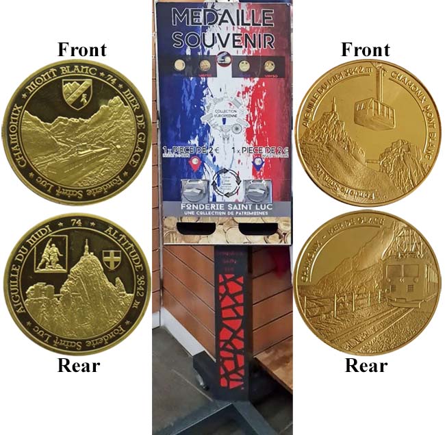 Token 2 Reverse: Aiguille du Midi the statue of the two French mountaineers who reached Europe's highest mountain for the first time and the Savoy coat of arms with 'Aiguille Du Midi 74 Altitude 3842 m Fonderie Saint Luc'.