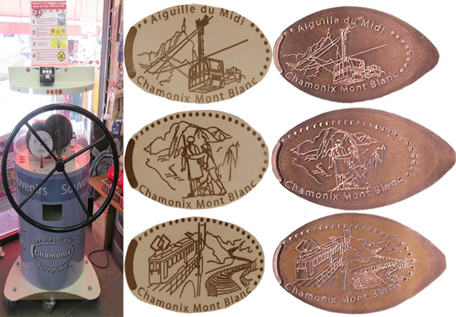 Token 2 Obverse: Access train to the Mer de Glace and coat of Arms of the city of Chamonix with 'Chamonix Mont Blanc 74 Mer De Grace Fonderie Saint Luc'.