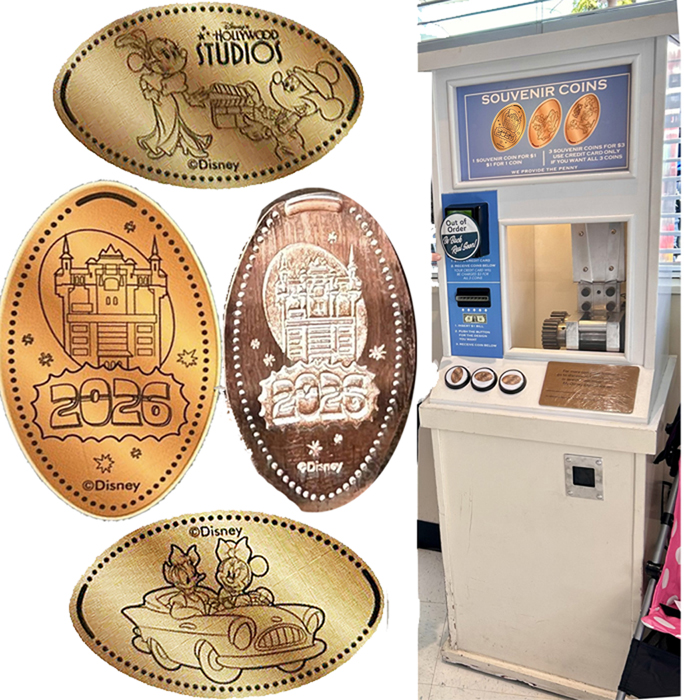 There are many machines throughout the park (a mix of Eurolink and PennyCollector) and they change constantly. No one list is accurate or complete, so please use the information here as a guide only. You may want to use the information here as a guide only. You may want to consult James' very fine listings available at presscoins before venturing out. And once in the park, you may also want to ask for a listing at Guest Services. Finally, if you've come unprepared and need quarters or pennies, the various shops are generally willing to help you out.