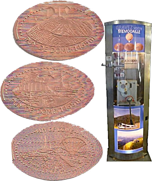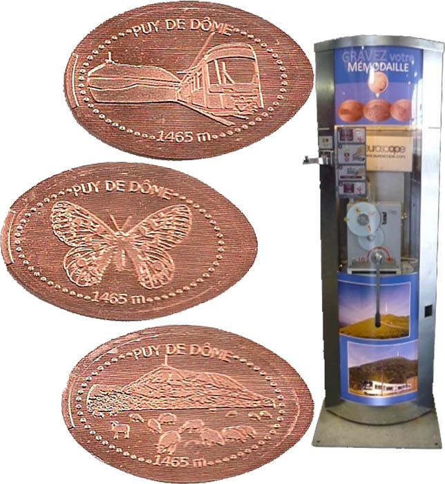 Machine 4 (Placed 2016) is in the hall near to the shop at the top of the Puy de Dôme. 1€ and 5 eurocent cost to press. Designs all have a beaded border with 'Puy De Dome 1465M':