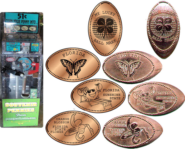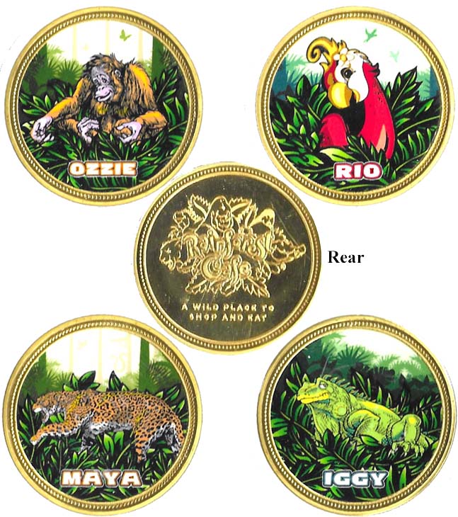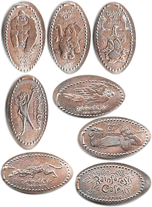 Machine 8 all have 'Rainforest Café Orlando, FL' on them. $1.00 each on pre-loaded Zinc pennies. Designs are: