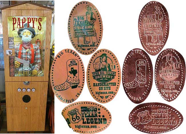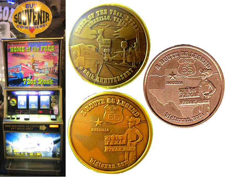 Retired Token Machine 2: 1) 'Big Texan Steak Ranch, Home of the Free 72oz Steak', Amarillo, Texas 50th Anniversary', Logo sign cars, Building. 2) 'Big Texan Steak Ranch, A Route 66 Legend, Amarillo www.bigtexan.com', Image of State, Logo sign and Route 66 sign, Brass color, 3) 'Big Texan Steak Ranch, A Route 66 Legend, Amarillo www.bigtexan.com', Image of State, Logo sign and Route 66 sign, Brown color.