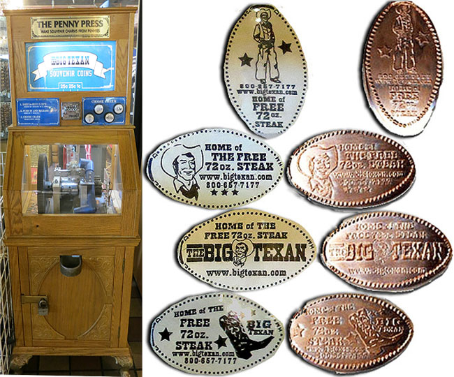 Retired Token Machine 1: 1) 'Home of the Free 72oz Steak Amarillo, Texas www.bigtexan.com', / Rear- 'The Big Texan Free 72oz Steak', 2) 'Home of the Free 72oz Steak Amarillo, Texas www.bigtexan.com', / Rear- 'The Big Texan Free 72oz Steak', 3) 'Home of the Free 72oz Steak Amarillo, Texas', / Rear- 'The Big Texan Free 72oz Steak'.