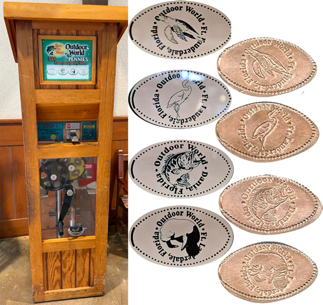 Machine 1: is located just past the cash registers, right in between the main exit doors and under the large shark head that is mounted to the wall. Costs $0.51 per design. All designs have 'Outdoor World':