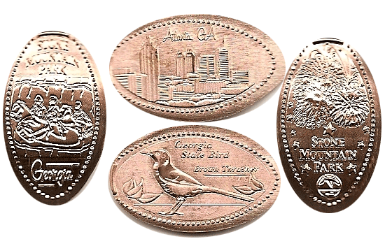 Retired 8: 1) Georgia State bird Brown 2) Thrasher, Atlanta city skyline, 3) Stone Mountain Park fireworks, 4) (V) Closeup of carving on side of mountain.
