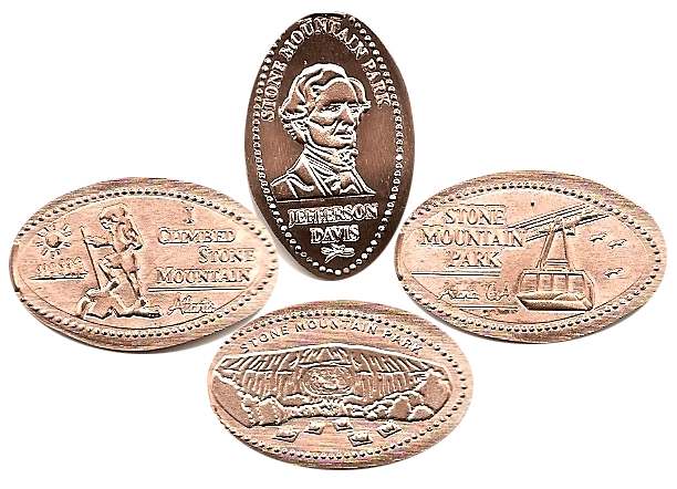 Retired 9: 1) Jefferson Davis, 2) I Climbed Stone Mountain with hiker and walking stick, 3) Side of mountain with carving and people watching laser show, 4) Skyride Car.