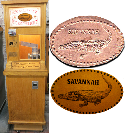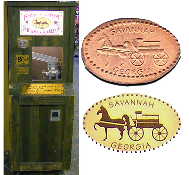 Machine 4 is across from the cashier's counter. Cost to press: 51¢ each design. Designs all have a beaded border: