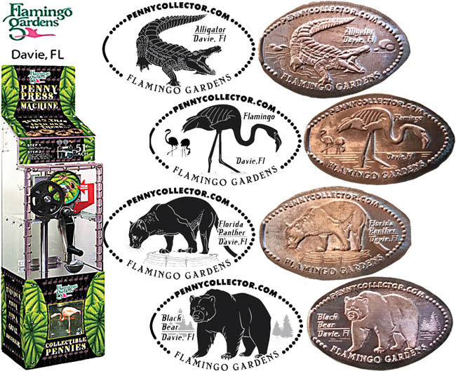 Retired 1: (Placed 12/13). Designs all have 'Flamingo Gardens Davie, FL' on them. 1. (H) Open mouth alligator with 'Alligator', 2. (H) Three flamingoes with 'Flamingo', 3. (H) Panther looking down from a rock with 'Florida Panther', 4. (H) Bear in front of trees with 'Black Bear'.