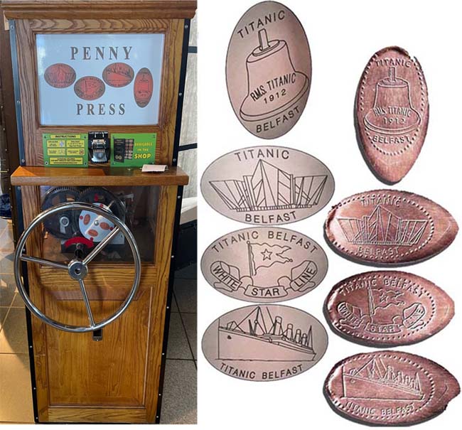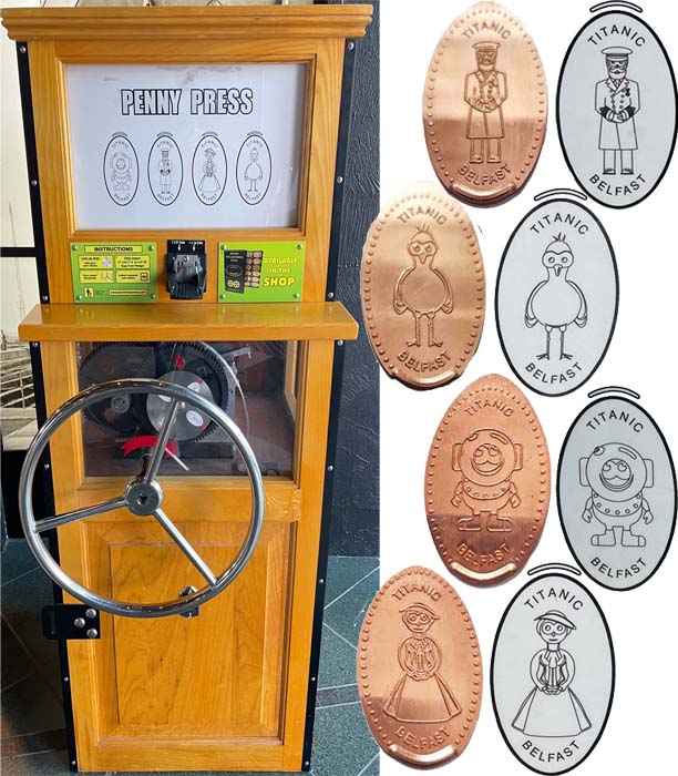 Machine 2 all have 'Titanic Belfast' on them. Located right outside the gift shop. Designs are: