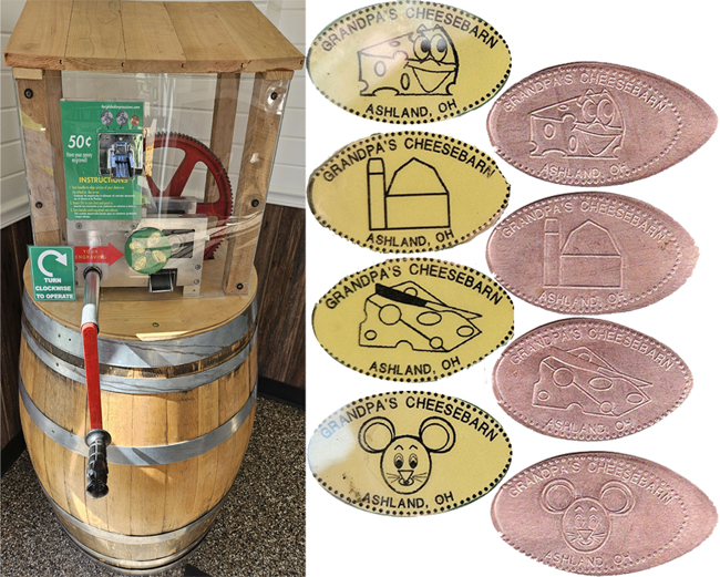 Machine 1 is near the main entrance, immediately to the left. Cost to press: 51¢ each design. Designs all have h 'Grandpa's Cheesebarn Ashland, OH' on them: