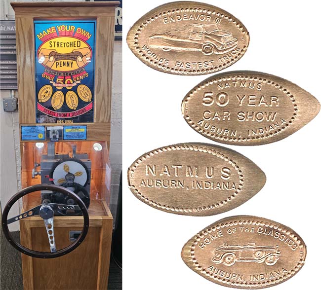 As of September 30, 2006, there was a 4-die manual machine in gift shop. You do not have to pay admission to reach it and it was pressing well. Go in the main entrance and machine is to the left next to the door where you start the tour. The hand crank is shaped like a car steering wheel and the wheel must be just past the arrow for the machine to accept the money.