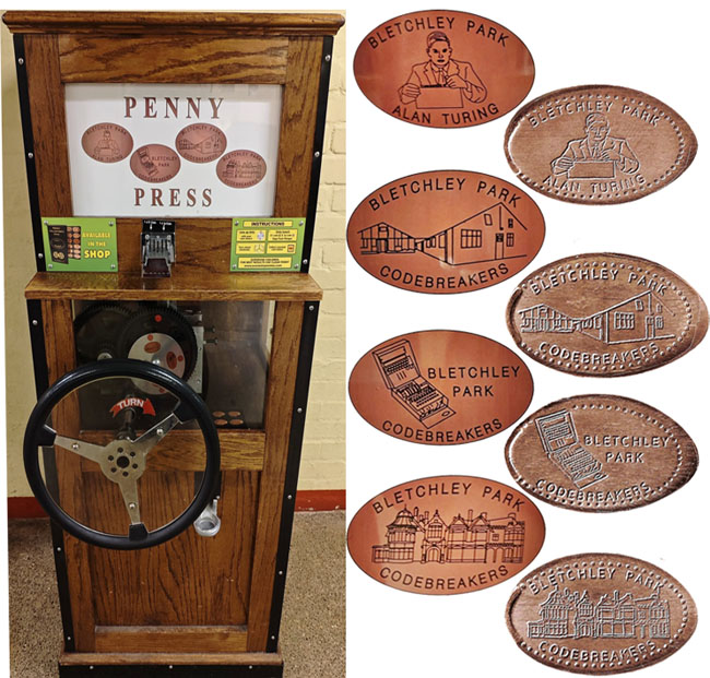 Machine is right near the bathrooms next to the gift shop., Each penny costs £1 plus the penny. Designs are: