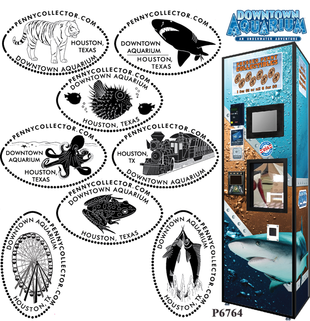 Machine 6: (2020) 8 design machine. Each design costs $1, all 8 for $5, Preloaded Zinc pennies. Designs are: