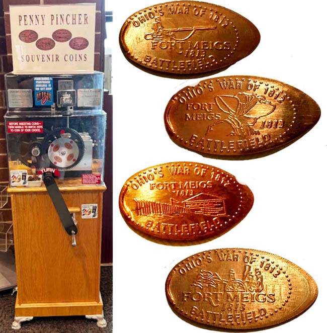 The machine is inside the Visitor Center near the Front Entrance. All have 'Ohio's War of 1812, Fort Meigs Battlefield 1813' on them. Designs are:
