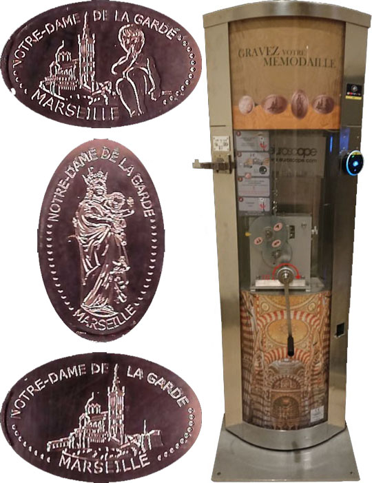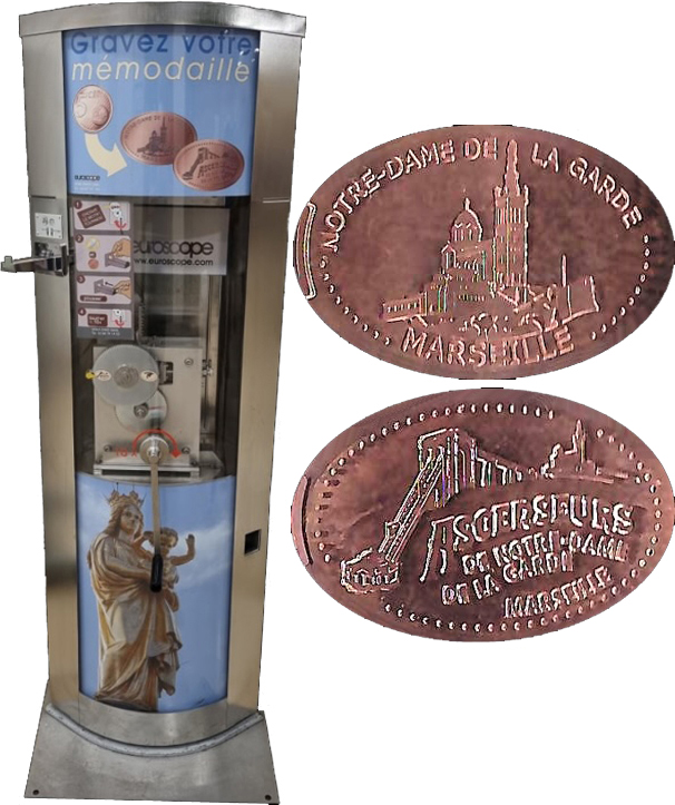 Machine 3 (Placed 10/2023) is on the second floor by the elevator. Cost to press: 2€ (A 2€ coin or two 1€ coins only Machine does not give change). The "penny" will be pressed on a supplied 5 Euro cent. Credit cards are accepted. Once you insert the coins or pay by credit card, wait 5 seconds for the supplied 5 Euro cent to drop into place before cranking the handle. Designs all have a beaded border with 'Notre-Dame de la Garde Marseille':