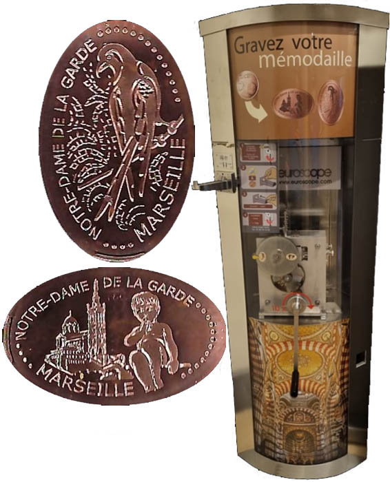 Machine 4 (Placed 10/2023) is on the third floor. Cost to press: 2€ (A 2€ coin or two 1€ coins only Machine does not give change). The "penny" will be pressed on a supplied 5 Euro cent. Credit cards are accepted. Once you insert the coins or pay by credit card, wait 5 seconds for the supplied 5 Euro cent to drop into place before cranking the handle. Designs all have a beaded border with 'Notre-Dame de la Garde Marseille':