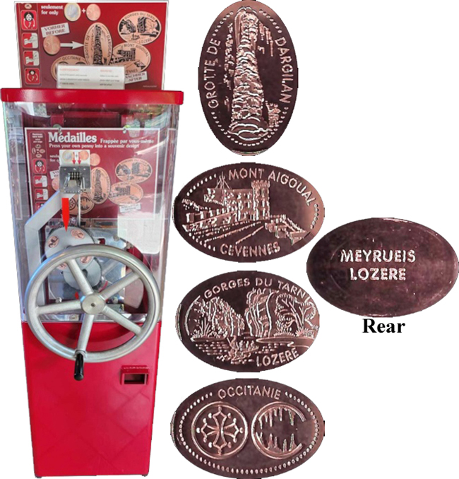 Machine 1 (Placed 7/2024) is in the gift shop. Cost to press: €1.05 each design (1€ coin and a 5 Euro cent coin). Designs all have a beaded border: