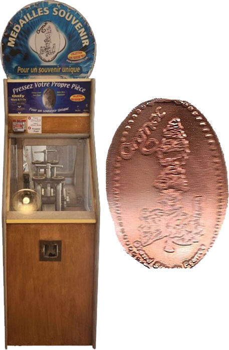 Machine 1 is in the souvenir shop/café. Cost to press: €1.05 (€1 coin and 5cent coin). Design has a beaded border: