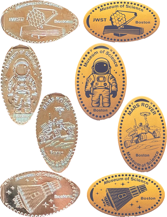 Retired 2, All have Museum of Science' on them: 1) Owl, 2) Space Shuttle, 3) 'Museum of Science Boston' logo/ 4) Tyrannosaurus Rex Retired Other (various machines over the years): A) Lion, B) Satellite, C) Muted Swan, D) Dolphin, E) Great White Shark, F) Planets, G) Mount Everest.