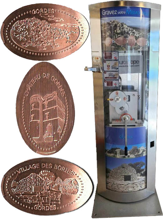 Machine 1 is in the ticket office. Cost to press: €1.05 (one Euro coin and one 5 Euro cent coin). Designs all have a beaded border with 'Gordes':
