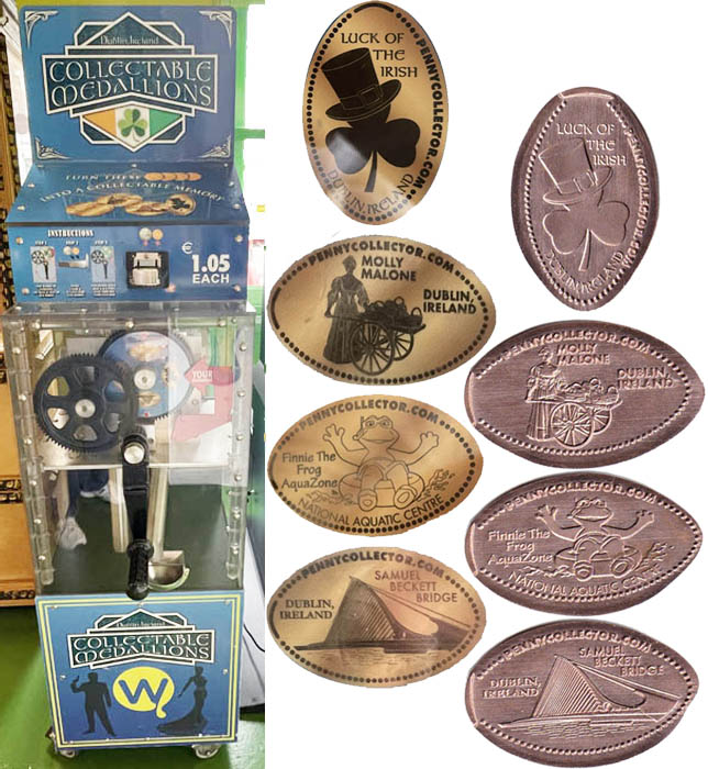 Machine 1 is located in the lobby and can be accessed without a ticket to the museum. It is a four-design Pennyman hand crank machine that costs 1 euro and 1 five-cent piece. Designs are: