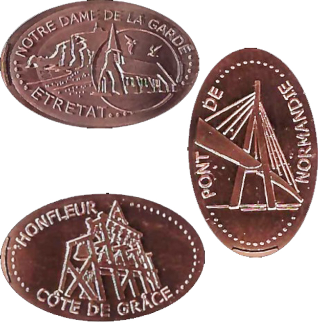 1) (H) Boat in front of Honfleur harbor with 'Honfleur Côte de Grâce'. 2) (V) Bridge over the Seine with 'Pont de Normandie' 3) (H) Bells of Norte Dame with 'Honfleur Côte de Grâce',