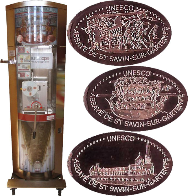 Machine 1 is inside de Boutique of Abbaye on the left side. Cost to press: €1.05 (€1 and 5 eurocent coins) per design. Designs all have a beaded border with 'UNESCO Abbaye De St Savin - Sur Gartempe':
