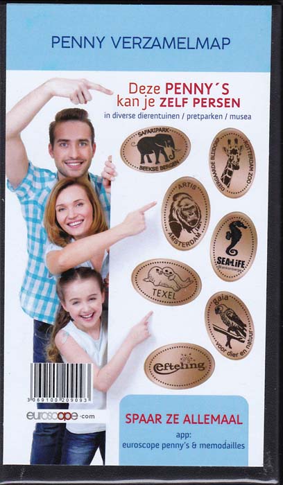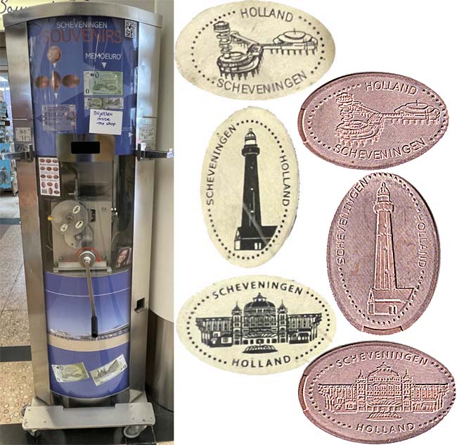 Machine 1 Euro cent is in front of the store. Cost to press: €1.05 each design (€1 coin and a 5 Euro cent coin). Designs all have a beaded border with 'Scheveningen Holland':