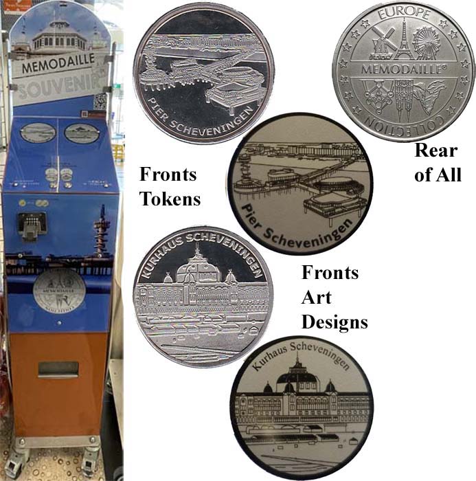 Token Machine 1 is in front of the store. Cost to dispense: €2. The coin slot will accept one 2 euro coin OR two 1 euro coins. Designs: