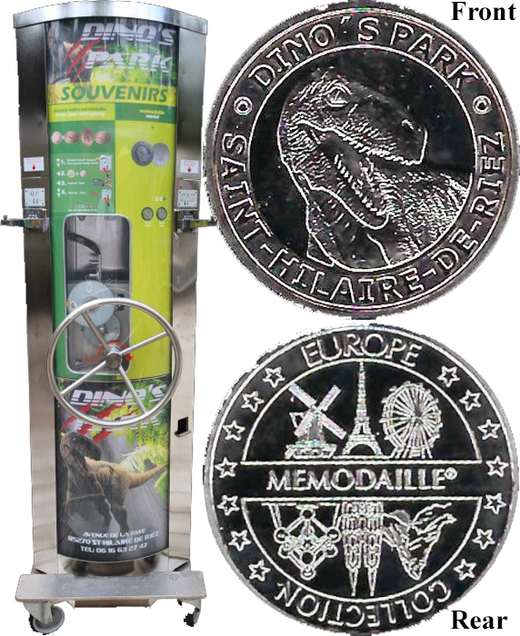 Machine 1 is a Euroscope dual function machine that presses euro cents OR dispenses a "Memodaille" token.