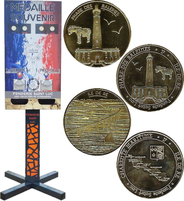 2) Reverse: Coat of arms of the island next to location of towns within an outline of Ré island with 'Charente Maritime 17 Ile de Ré Fonderie Saint-Luc'.