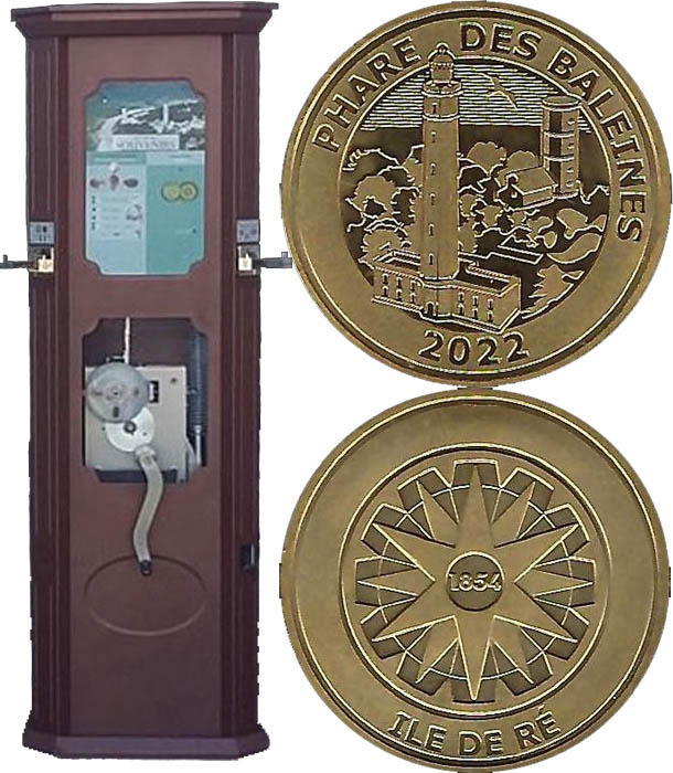 Retired 1 (Token) - Removed 2024, 1) Obverse: Aerial view of lighthouse and tower with 'Phare des Baleines 2022'/ Reverse: Geometric design with '1854 Ile de Ré'.