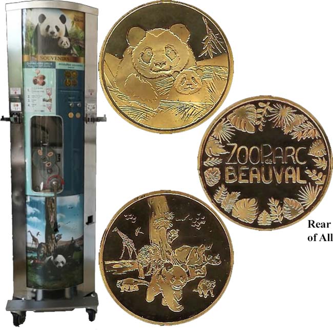 Machine 2 (Eurocent) is in the gift shop. Each cost €1.05 (€1 coin only on a 5 Eurocent). Designs all have a beaded border with 'ZooParc de Beauval'.