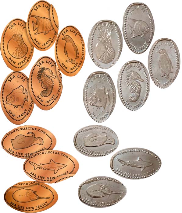 Machine 1: All have Sea Life New Jersey' on them. $1 each, 8 for $5. Pre-loaded Zinc pennies. Penny designs are: