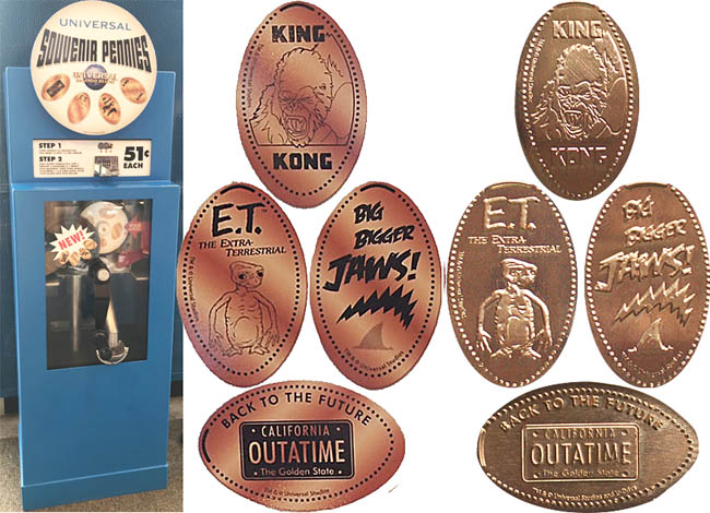 Retired Token Machine 5: 1) 'Jaws', Shark head facing up, 2) '40th Anniversary', ET being carried on a bicycle by the boy to the right, 3) 'Save the Clock Tower (Back to the Future/ Now in Token Machine 3) 4) 'Kong, the 8th Wonder of the World', holding a tram car.