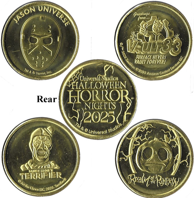 Retired Token Machine 9: (2024/ Halloween Horror Night Tribute House Medallions): 1) 'Ghostbusters', ghost, 2) 'Major Sweets', 3) Melting scary Pumpkin, 4) 'A Quiet Place', Islands/ Rear: Universal Studios Halloween Horror Nights