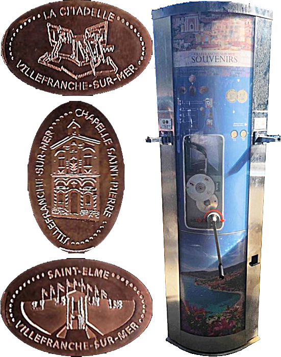 Machine 1 Eurocent is outside at the scenic overlook. Cost to press: €1.05 each design (1€ coins and a 5 Euro cent coin). Designs all have a beaded border with 'Villefranche-sur-Mer':