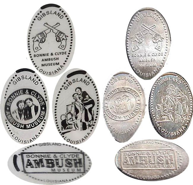 Retired 1: 1) 'Bonnie and Clyde Ambush Museum Gibsland, Louisiana', License Plate type word logo, 2) 'Bonnie and Clyde Ambush Museum Gibsland, Louisiana', Bonnie and Clyde portrait in a circle logo, 3) 'Bonnie and Clyde Ambush Museum Gibsland, Louisiana', two crossed guns, 4) 'Gibsland, Louisiana', Bonnie and Clyde in front of their car.