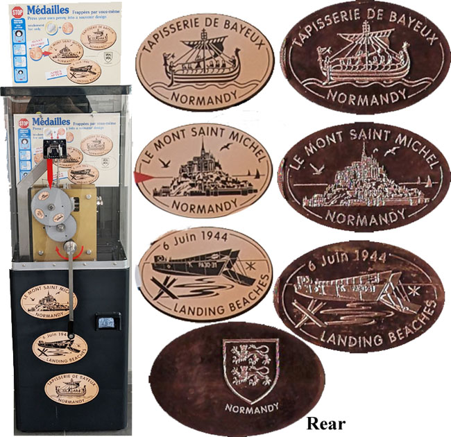 Machine 1 is in the main lobby of the Gare Maritime building. Takes a 1 euro coin and a 5 eurocent coin per design. Designs have a ringed border;
