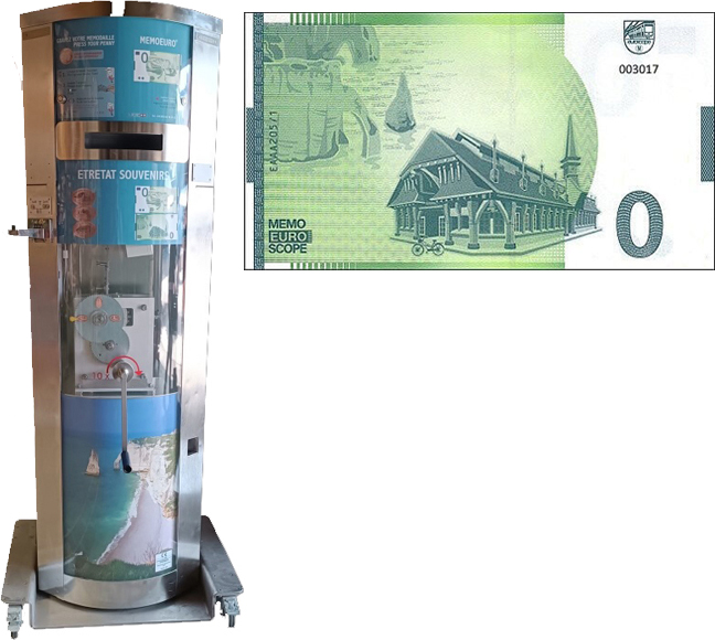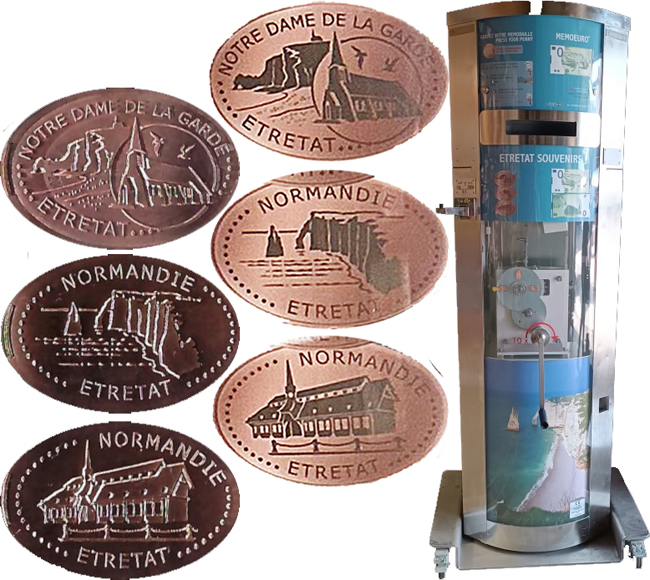 Machine 1 Euro cent is inside the old market (tourist shop) at the entrance. Designs all have a beaded border with 'Etretat':