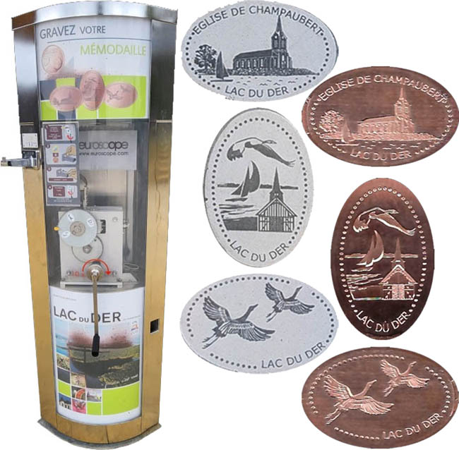 1 bis rue de La Cachotte GRAND EST / MARNE - Giffaumont - Champaubert, France, 51290 Phone: +33 326 726 280 Website There is a stretched penny machine at the Lac du Der tourism office in the Champagne region. Lac du Der is the largest artificial lake in France, and there are many popular lake activities, including birdwatching and sailing (both featured on pennies). They also have a nice shop of local speciality food and wine.