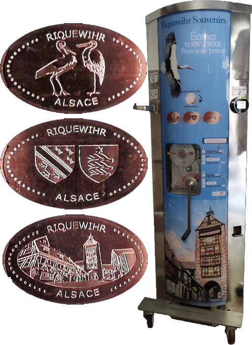 Machine 1 is in the pedestrian zone in front of the souvenir shop "Au Four Banal". Cost to press: €2. The coin slot will accept one 2 euro coin OR two 1 euro coins. This machine takes credit card with tap device. Designs all have 'Riquewihr Alsace' on them: