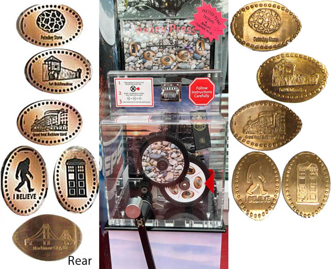9/29/25 Presses very well on pre-82 pennies. The machine is located outside in front of store which is located next to Mind Thrill. They do sell Penny Passports. |