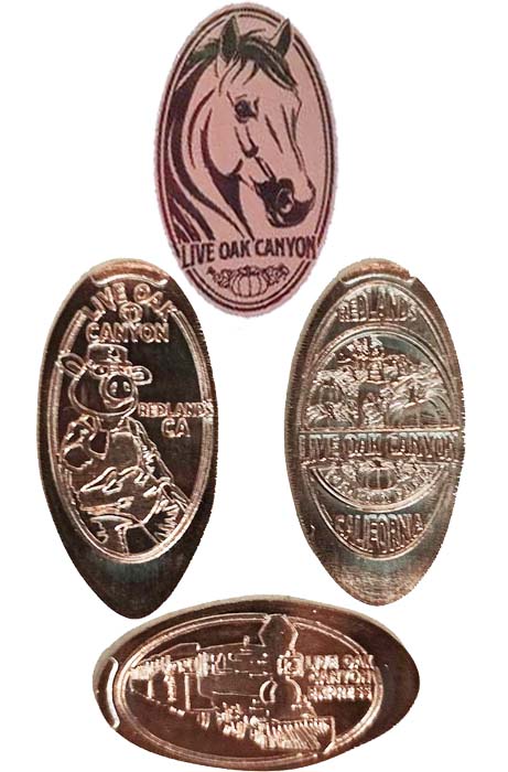 Machine is at entrance to train ride. All have 'Live Oak Canyon, on them. Designs are: